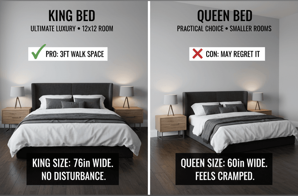 • Choose a King if: You have a 12×12 room, you previously enjoyed a King, and you value sleep surface area over having extra floor space for a desk or chair.